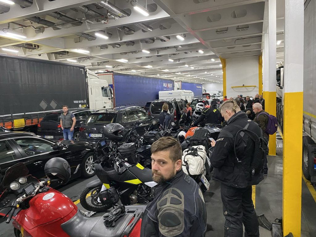 Was ein Anfang. 29 Grad Tages Temperatur und die Füße haben gequalmt. Alles gut gelaufen und gut eingecheckt. Das einzigste was uns Sorgen macht, ist der Spruch „Nix festmachen, ruhige See“. Also stehen die Mopeds jetzt unten und sind nicht verzurrt.
