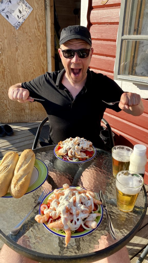 Zum Abendessen passen wir uns mal den Temperaturen an. Es gibt Salat mit Huhn für Bärchen und mit Scampi’s für mich.