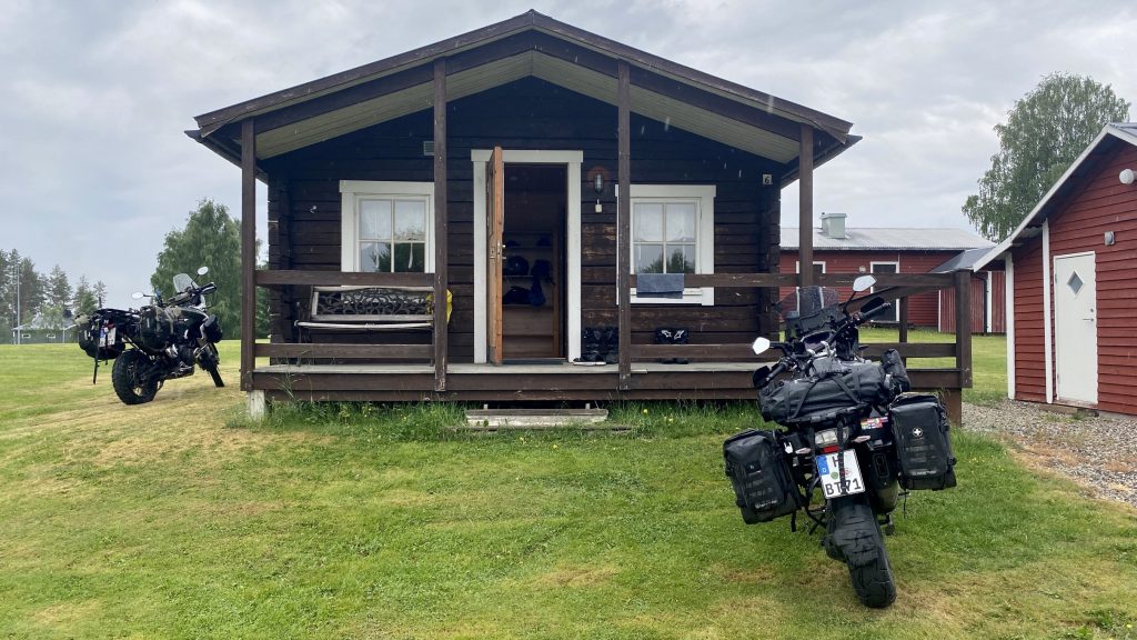 Und um 15.00 haben wir dann unser Ziel erreicht. Den Campingplatz in Åmsele. 400km Strecke und nur leichter Regen für 30 min. Als wir unsere Motorräder abgeladen haben, öffnete Petrus seine Schleusen und es regnete in Strömen. Wir haben aber eine tolle Hütte mit reichlich Platz und sogar einem eigenen WC. Dieses lernt man dann schätzen, wenn man Morgens in der Schlange stehen muss, wenn zu wenig WCs vorhanden sind. Weitere Einzelheiten erspare ich Euch.